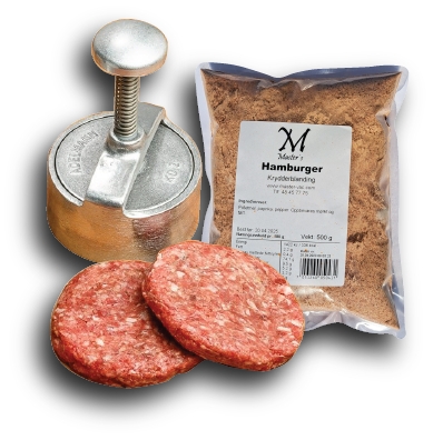 Pakke med Krydder og Fjærbelastet Hamburger presse - I rustfritt stål! NB. Bildet stemmer ikke, da det er komt en ny modell hamburgerpresser.